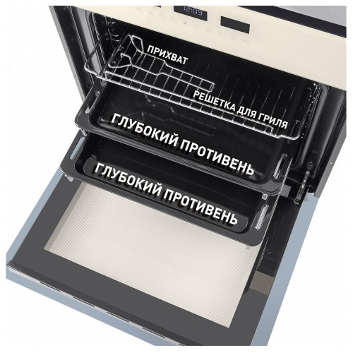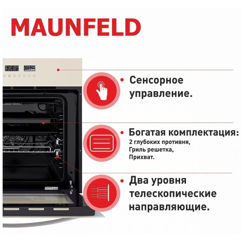 Артикул: 607-947 Встраиваемый электрический духовой шкаф Maunfeld EOEH 5811BG Духовой шкаф MAUNFELD EOEH.5811BG оснащен разнообразным набором функций для приготовления: Функция нижнего и верхнего нагрева, функция нижнего нагрева, гриль, гриль с конвекцией, гриль с верхним нагревом, конвекция с нижним нагревом, полная конвекция с нижним нагревом, функция нижнего и верхнего нагрева с конвекцией, функция полной конвекции/равномерная выпечка, функция размораживания, внутренний свет/освещение. Объем прибора составляет 58 литров. Духовка оснащена сенсорным программатором с дисплеем ''Cold White'', интуитивно понятным и удобным в использовании. Внутреннее покрытие камеры выполнено из специальной эмали обладающей особенными свойствами к расщеплению осевшего на стенки жира, что позволяет легко очищать ее поверхность.