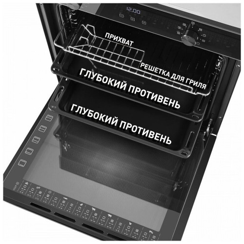 Стильный электрический встраиваемый духовой шкаф из новой серии MAUNFELD MASTER - это сочетание высокого качества сборки, эксклюзивного дизайна и расширенного функционала. Объем 76 л при стандартных размерах 60 см позволяет готовить одновременно несколько блюд. Внутреннее покрытие камеры выполнено из специальной легкоочищающейся эмали черного цвета. Дверца духового шкафа состоит из 3-х стекол, что создает холодный фронт и делает процесс приготовления безопасным, исключая возможность ожога при касании. Тонировка на внутреннем стекле дверцы создает визуальный эффект непрозрачности фасада: при выключенном освещении не видно посуду, находящуюся внутри духовой камеры, а при включенном освещении можно в деталях рассмотреть весь процесс готовки. Фронтальная панель духовки изготовлена из высококачественного жаропрочного тонированного стекла черного цвета. Цельнометаллическая фурнитура (ручки управления и ручка дверцы), выполненная в черном цвете, не нагревается в процессе готовки. Комбинированное управление реализовано в виде сенсорного дисплея и поворотных ручек. Можно выбрать режим работы, температуру (50°-250°C), установить таймер и блокировку от детей. В данной модели есть 10 режимов: традиционный нагрев, большой гриль, конвекционный нагрев, малый гриль, разморозка, конвекция с нижним нагревом, горячий воздух, пицца, объемный турбогриль, освещение.