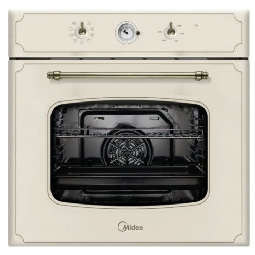 Артикул: 415-294 Встраиваемый электрический духовой шкаф Midea MO581DBRI-B В электрическом духовом шкафу Midea MO581DBRI-B очарование стиля ретро сочетается с самыми современными возможностями приготовления и большой вместительностью. Объём 70 литров позволит вам зажарить на гриле крупную птицу и за один подход напечь пирожков для всей семьи. Используйте «Верхний и нижний нагрев» для выпечки, «Нижний» – для запеканок и пиццы, «Гриль» – для жарки колбасок, сосисок, куриных крылышек или свиных рёбрышек. Желаете «загрузить» целую индейку или окорок? К вашим услугам «Двойной гриль с вентилятором»: горячий воздух будет распределяться по всему внутреннему пространству, и даже большие порции запекутся равномерно. Всего у прибора девять режимов работы. Яркая подсветка позволит не впускать лишний раз внутрь прохладу: следите за процессом, не открывая дверцу. Тройное остекление не даст ей сильно нагреться – при случайном касании ожог вам не грозит. В случае перегрева духовка автоматически выключится. При помощи двух поворотных регуляторов выбирайте режим и задавайте температуру в диапазоне от 0 до 250 градусов. Отслеживайте время работы по аналоговым часам или избавьте себя от этой заботы и установите таймер. Когда всё будет готово, шкаф отключится, и вы услышите звуковой сигнал. В комплект входит металлическая решётка для жарки и глубокий противень – искать подходящие аксессуары не потребуется.
