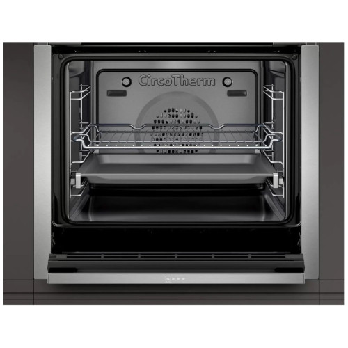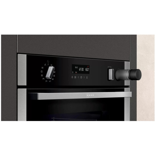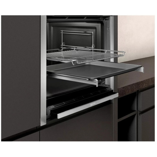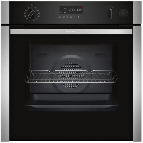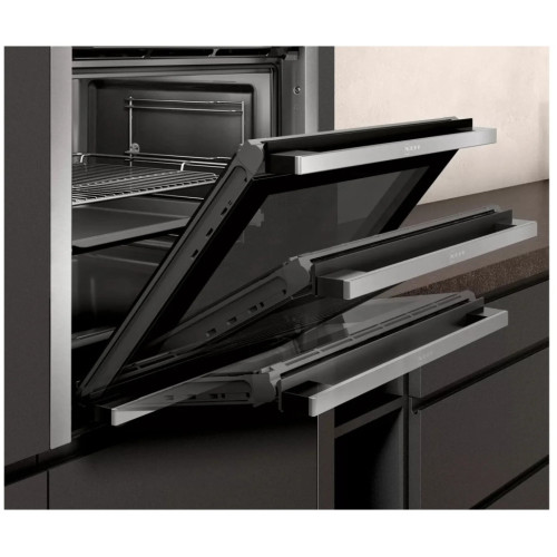 Встраиваемый духовой шкаф с функцией добавления пара. 8 режимов нагрева: CircoTherm, верхний/нижний жар, гриль с конвекцией, большой гриль, режим для пиццы, режим для выпечки, Circotherm Gentle, подогрев готовых блюд. С технологией HomeConnect вы можете наслаждаться свободой, которую дает возможность управления приборами с помощью приложения на вашем смартфоне или планшете. Теперь не обязательно находиться рядом с прибором, чтобы начать, отслеживать и корректировать процесс приготовления по мере необходимости. Slide&Hide – немного волшебства на вашей кухне. Дверца Slide&Hide плавно исчезает в нише под рабочей камерой, не уменьшая объем духовки и обеспечивая удобный доступ к блюду. Больше никаких неудобств при извлечении любимого блюда. При открывании и закрывании дверцы духового шкафа ручка повторяет движение вашей кисти и всегда находится в удобном положении. CircoTherm: режим одновременного приготовления нескольких блюд. Праздничный ужин из 3 блюд для всей семьи возможен с CircoTherm NEFF. Румяный кекс, запеченный картофель, ароматная овощная запеканка, пряная баранина или запеченная рыба – любое сочетание блюд можно приготовить одновременно в духовке NEFF. Запахи не смешиваются, а блюда сохраняют оригинальный аромат Существует множество вариантов приготовления блюд в духовом шкафу. Переставляемые телескопические направляющие позволяют разместить блюда на нужном уровне, что бы вы ни задумали приготовить, – мясо, птицу, кондитерские изделия. Очистка: Самоочистка Eco Clean: верхняя стенка, задняя стенка, боковые стенки. Режим самоочистки EasyClean. Полностью стеклянная внутренняя поверхность двери. Комфорт: Многофункциональные часы EasyClock включают в себя бытовой таймер, таймер приготовления, установку окончания приготовления. Рекомендация температуры для каждого вида нагрева. Индикация фактической температуры в духовке через нажатие клавиши Info. Простая регулировка температуры. Программа удаления накипи. Быстрый разогрев PowerBoost позволяет устанавливать блюдо в холодную духовку, что сокращает время приготовления. Галогенное внутреннее освещение. Выдвижная панель управления скрывает резервуар для воды. Система охлаждения прибора позволяет встроить в любой кухонный гарнитур. Функция "Детская безопасность" с возможностью настройки автовключения. Автоматическое защитное отключение в зависимости от выставленной температуры и времени работы. Индикация остаточного тепла.
