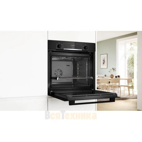 Духовой шкаф Bosch HBA534EB3 выполнен в строгом чёрном цвете, что позволяет гармонично интегрировать прибор в любые интерьерные решения кухни и подчеркнуть сдержанную элегантность пространства.