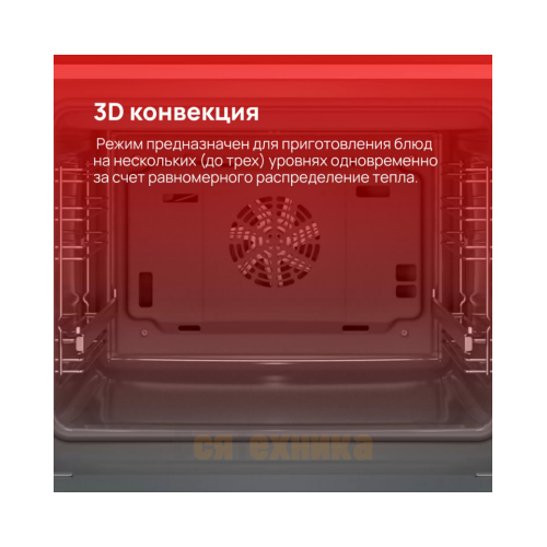 - Циркуляция воздуха (конвекция): Вентилятор обеспечивает равномерную циркуляцию горячего воздуха по всему объему камеры. Идеален для одновременного приготовления на нескольких уровнях, запекания мяса и овощей с хрустящей корочкой.