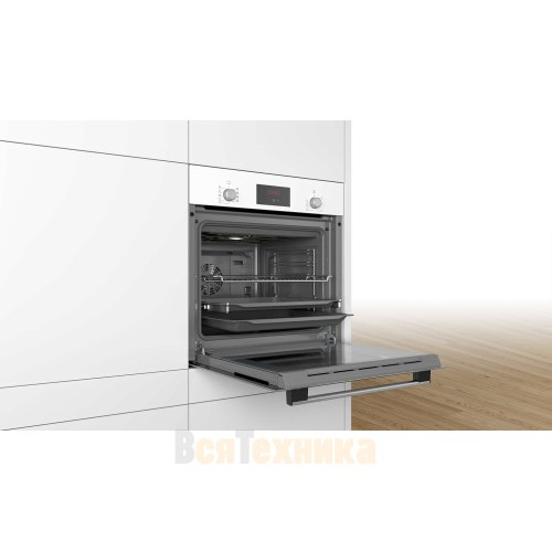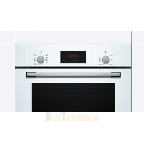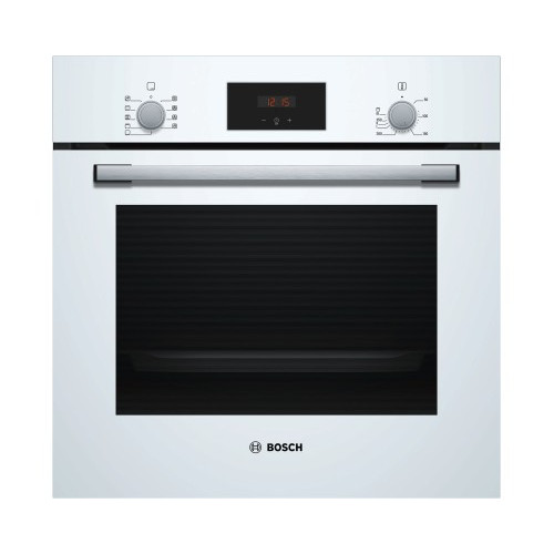 Духовой шкаф Bosch HBF114EW0R выполнен в белом цвете и оснащен удобным управлением с помощью поворотных переключателей и LCD-дисплея, что позволяет точно выбрать и настроить требуемый режим