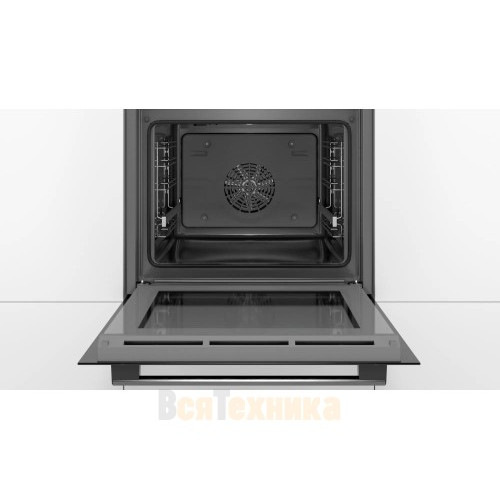 Духовой шкаф BOSCH HBG537EB0R оснащен очисткой EcoClean, жировые загрязнения распадаются на углекислый газ и воду под воздействием высоких температур. Прибор оснащен откидной дверцей и хромированными направляющими.