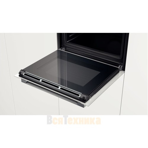 Духовой шкаф Bosch HBG672BW1F выполнен из комбинации белого стекла и нержавеющей стали. Панель управления — полностью сенсорная, с центральным плоским поворотным регулятором в виде кольца.