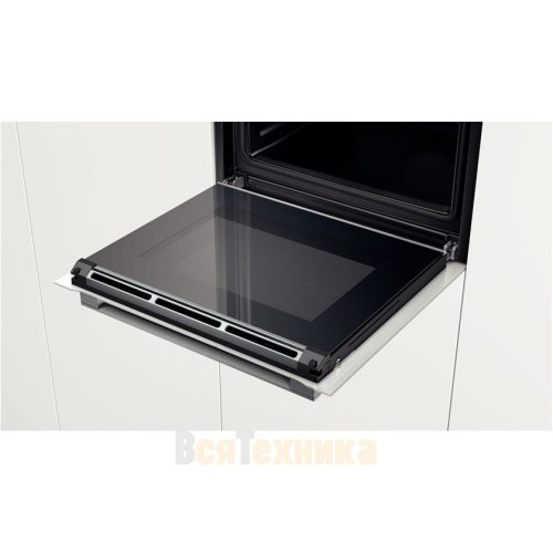 Духовой шкаф Bosch HBG6750W1 оснащен пиролитической очисткой, загрязнения под воздействием высоких температур превращаются в пепел, поле необходимо протереть внутреннюю поверхность влажной тканью. В модели предусмотрены одноуровневые телескопические направляющие, которые позволят безопасно выдвигать горячий противень. Индикация остаточного тепла указывает на высокую температуру в духовке.