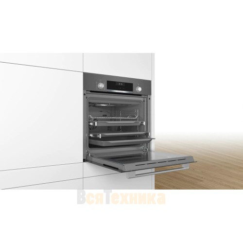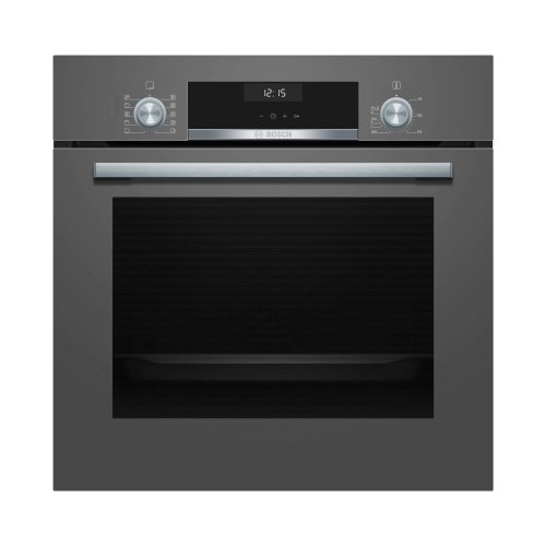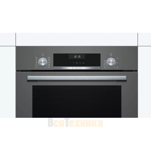 Духовой шкаф Bosch HBJ558YH0T выпускается в стильном цвете тёмного серебра, дисплеем и управлением в виде поворотных утапливаемых переключателей.