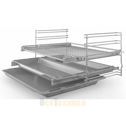 Амортизатор SoftClose плавно закрывает дверцу без хлопка, телескопические направляющие на 2 уровнях обеспечивают удобный доступ к блюдам. В комплекте кроме решетки и универсального противня идут два узких, на которых удобно печь пироги и разогревать полуфабрикаты глубокой заморозки.
