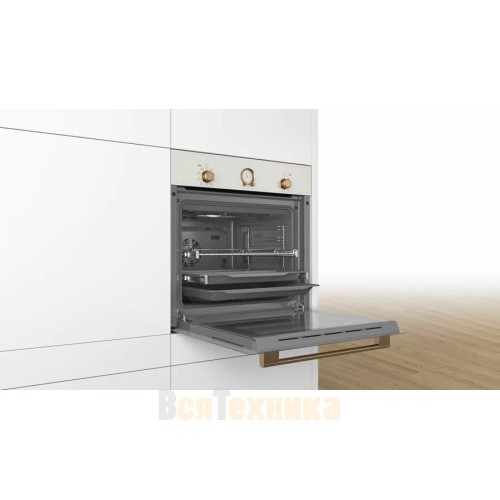 Духовой шкаф BOSH HIJN10YW0R изготовлен в элегантном, жемчужно-белом цвете. Он отлично сочетается с фурнитурой «Под бронзу»