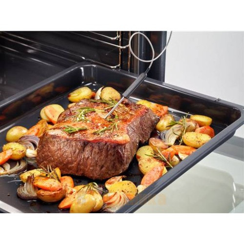 В комплекте идет термощуп. Просто вставьте его в центр блюда (например, в большой кусок мяса или птицы), задайте желаемую внутреннюю температуру на панели управления — и духовка автоматически выключится, когда блюдо будет готово. Это гарантия идеальной прожарки стейка или сочной индейки.