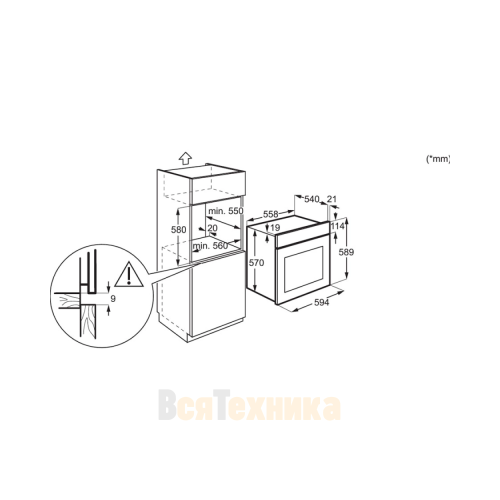 - Габариты (ВxШxГ) для встраивания: 59.4 x 59.4 x 56.7 см