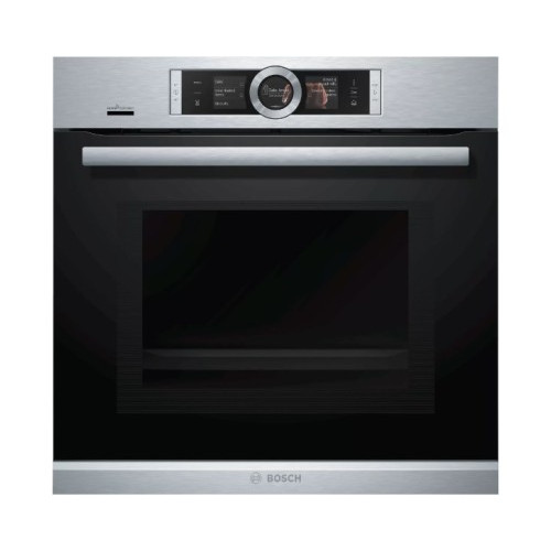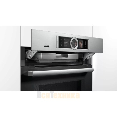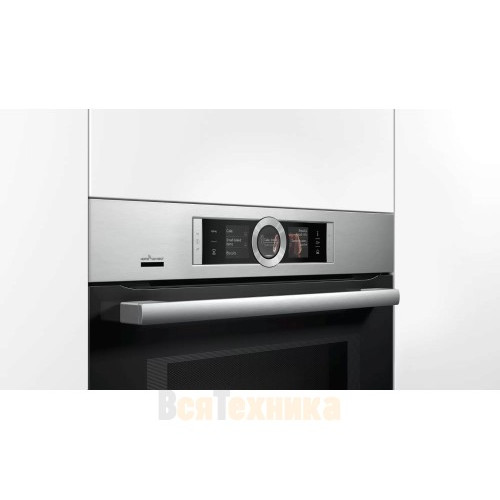Духовой шкаф Bosch HNG6764S6 — модель из серии Serie | 8 с микроволнами и паром. Прибор выполнен в черном цвете с цветным сенсорным дисплеем