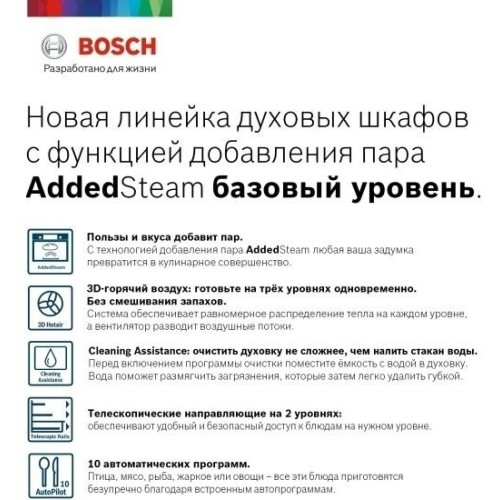 Встроенная духовка с автопилотом и добавлением пара: автоматически готовит ваши блюда, чтобы они были хрустящими и сочными. AddedSteam базовый уровень: обеспечивает идеальные условия пара для приготовления ваших любимых блюд. 3D-горячий воздух: безупречное приготовление нескольких блюд одновременно. Режим