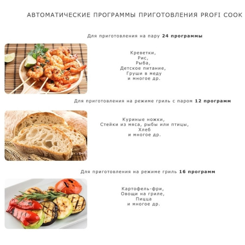 Комбинированный духовой шкаф-пароварка Общие данные: Габариты: 59.5x59.5x56.3 см Габариты ниши для встраивания: 59x56.2x55 см Объем: 66 л Гриль: есть Конвекция: есть Подсветка духовки: есть Количество режимов работы: 10 Самоочистка: эмаль Принадлежности: универсальный противень, глубокий противень/поддон для жира, решетка для жарки Режимы: Обдув горячим воздухом Верхний и нижний нагрев Верхний и нижний нагрев с обдувом Верхний нагрев Гриль Гриль с обдувом Нижний нагрев с обдувом Программа выпекания пиццы Pizza Cook Сенсорное управление Easy Control ClearView - большое окно рабочей камеры духовки Холодное атермальное стекло CoolTouch Конвекция с паром Размораживание Автоматические программы приготовления Profi Cook: Для приготовления на пару 24 программы Например: Креветки, Рис, Свиные котлеты, Груши в меду Для приготовления на режиме гриль с паром 12 пр. Например: Куриные ножки, Стейки из трески, Говяжий рулет, хлеб Для приготовления на режиме гриль 16 пр. Например: Сладкий картофель, овощи на гриле, пицца с беконом Управление и функции: Сенсорное управление Logic Control LCD-дисплей Функция памяти Система подачи пара Цифровые часы с таймером автоматического отключения Конвекция Автоматические программы приготовления Profi Cook Разморозка Поддержание тепла Обеззараживание паром Сушка Самоочистка паром Ферментация Безопасность: Количество стекол в двери: 3 Атермальное стекло CoolTouch Система охлаждения Защита от детей Система охлаждения Дополнительная информация: 5 уровней приготовления Стеклянный фронт ClearView Максимальная температура: 250C
