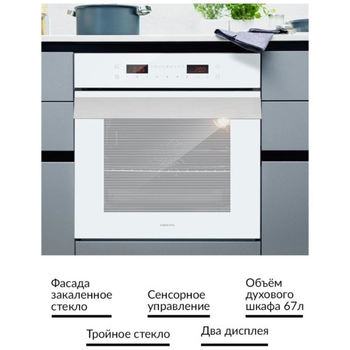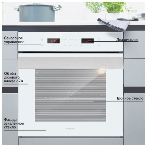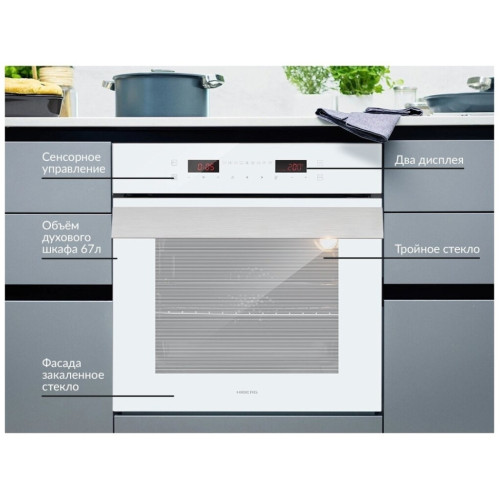 Встраиваемый электрический духовой шкаф HIBERG VM 6192 W выполнен в современном и стильном дизайне, поэтому идеально впишется в любой интерьер кухни! Духовой шкаф, общим объемом 67 л, имеет 8 программ приготовления и внутреннюю подсветку. Кольцевой нагревательный элемент, расположенный на задней стенке внутри камеры, способствует равномерному распространению жара по всему пространству духовки. Максимальная температура нагревания 250C. Управление моделью – электронное (сенсор). На LED дисплее отображаются установленные параметры по программам, температура и таймер. Благодаря таким функциям, как быстрый нагрев, автоматическое, полуавтоматическое и отложенное приготовление – процесс готовки станет еще проще. Встроенная функция гриль с вертелом позволяет приготовить мясо с румяной корочкой, а так же рыбу или овощи. Дверца выполнена из тройного съемного закаленного стекла с одним теплоотражающим слоем, а особый механизм на доводчиках делает закрывание плавным, тихим и удобным. Широкая стильная ручка выполнена из металла. Духовой шкаф оснащен 5-ти уровневыми хромированными направляющими и телескопическими направляющими (1 уровень), которые позволяют легко выдвигать противень и решетки за пределы духовки. Каталитические пластины, которыми оборудован внутри духовой шкаф, расщепляют жир и загрязнения во время приготовления при температуре от 150 градусов. Это обеспечивает легкий уход за внутренним покрытием. Особенности и преимущества: - цвет фасада: белое стекло; - электронный тип управления; - таймер с звуковым сопровождением; - доводчик дверцы духовки; - вертел в комплекте; - конвекция; -система охлаждения духовки; - каталитическая самоочистка; - функция «замок от детей». Оцените высокую функциональность и премиум качество духового шкафа HIBERG VM 6192 W/B!