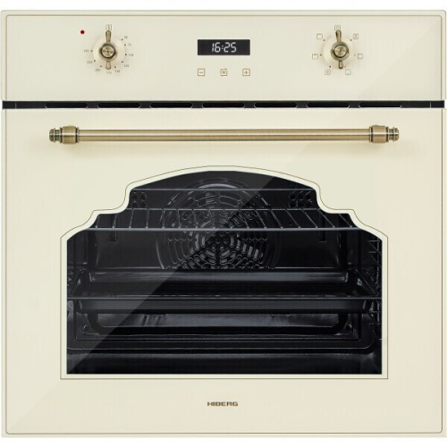 Встраиваемый электрический духовой шкаф HIBERG в ретро-дизайне идеально подойдет для кухни в классическом стиле, кантри или Прованс . Класс эффективности А позволяет экономить электроэнергию. Внутренний объем 70 л подходит для приготовления пищи на большую семью. Откидная дверца духовки с доводчиками, а так же оснащена двумя термостойкими стеклами. Материал фасада – закаленное стекло. Кольцевой нагревательный элемент, расположенный на задней стенке внутри камеры, способствует равномерному распространению жара по всему пространству духовки. Максимальная температура нагревания 250оC. 6 режимов приготовления регулируются поворотными металлическими переключателями, а на электронном дисплее можно выставлять таймер или часы. Благодаря функции гриль, вы можете приготовить мясо, рыбу или овощи с аппетитной корочкой. 5-ти уровневые хромированные направляющие позволяют плавно и легко выдвигать противень и решетки за пределы духовки. Внутренняя подсветка духового шкафа позволяет следить за приготовлением пищи, не открывая дверцы. Каталитические пластины, которыми оборудован внутри духовой шкаф, расщепляют жир и загрязнения во время приготовления при температуре от 150 градусов. Это обеспечивает легкий уход за внутренним покрытием Интегрированная система охлаждения корпуса не допускает перегрева и обеспечивает полную безопасность. Доводчик двери обеспечивает тихое, плавное и плотное закрытие, не требуя никаких усилий для пользователя.