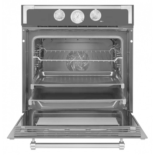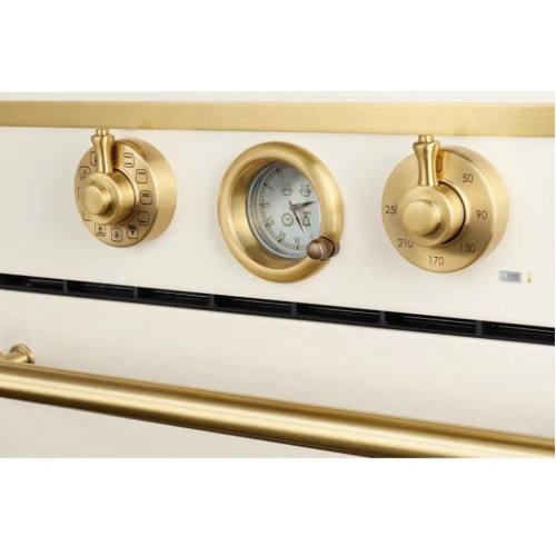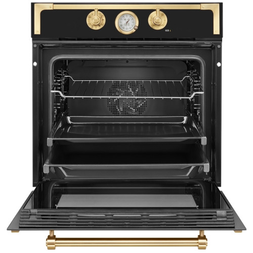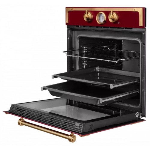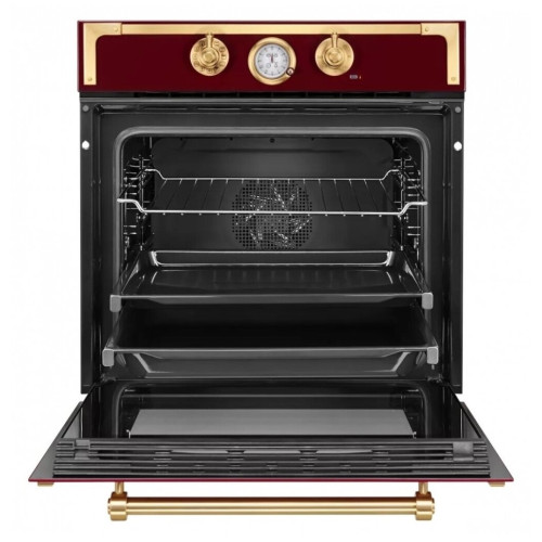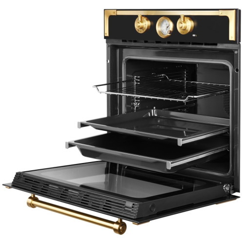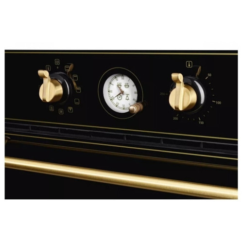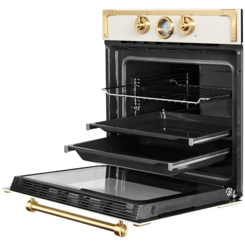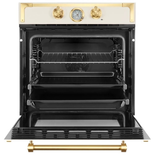 Аутентичный таймер Таймер, стилизованный под старинные часы с римским циферблатом, станет оригинальным украшением классического интерьера кухни. металлическая фурнитура Фурнитура духового шкафа выполнена из прочного металла с применением ручной обработки. При изготовлении каждой детали применяется индивидуальный подход, поэтому гарантируются такие свойства: высокий уровень качества; надежность и прочность; долгий срок службы. Эстетичный дизайн элементов из металла подчеркивает изысканность духового шкафа и создает особенный антураж всего кухонного помещения разморозка Программа разморозки духового шкафа быстро и эффективно подготовит замороженные полуфабрикаты к приготовлению. Благодаря данной полезной функции, больше не понадобится размораживать продукты при комнатной температуре или в холодильном отсеке быстрый нагрев Функция быстрого нагрева, сокращает время необходимое для поднятия температуры до нужного уровня. Каждый раз используя духовой шкаф вы будете экономить свое время избегая долго ожидания прогрева камеры духовки. турборежим Главная особенность турборежима состоит в равномерном нагревании всего объема духовки на разных уровнях. Приготовление блюд может производиться без необходимости их передвигать или переворачивать. Объясняется это тем, что горячий воздух поднимается от центрального нагревателя и распределяется по всей камере с одинаковой интенсивностью. камера 70 литров Внутренняя камера духовки объемом 70 литров позволит разместить как большие блюда целиком, так и установить много маленьких форм для запекания на разных уровнях. Основные достоинства камеры духовки: отсутствие швов; нет стыков, в которых скапливается грязь; простота процесса очистки камеры. съемная И полностью разборная дверь Для проведения тотального очищения духового шкафа, следует предпринять ряд простых шагов: без приложения особых усилий снять дверцу; вытащить стекла; тщательно промыть все укромные уголки прибора. По окончании, с той же легкостью, следует собрать конструкцию и установить ее обратно без применения специальных инструментов двухуровневые телескопические направляющие Наличие съемных телескопических двухуровневых направляющих обеспечивает удобство и эффективность работы с духовым шкафом. Основные преимущества: выдвижной механизм; плавный и мягкий ход полозьев; надежная установка; наличие упоров, блокирующих выпадение противня; сведение к минимуму риска термических ожогов. доводчик двери Духовой шкаф оснащен современными и надежными петлями с автоматическим доводчиком дверцы. охлаждение дверцы 3 стекла Дверца духового шкафа не нагревается, благодаря инновационной технологии охлаждения.