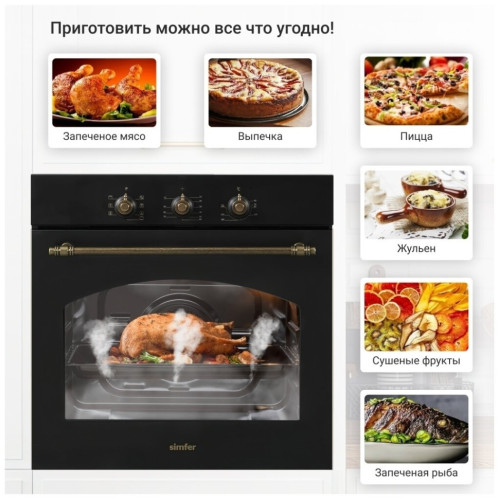 Электрический духовой шкаф Simfer B6EL18017 - современная техника для кухни, которая благодаря многообразию режимов, позволяет готовить не только повседневную пищу, но и изысканные блюда. Она снабжена функцией конвекции, которая равномерно распределяя теплый воздух, пропекает блюдо со всех сторон. С помощью удобных поворотных ручек легко выбрать необходимый режим приготовления для любого рецепта. Встроенная подсветка позволит наблюдать за процессом, не открывая при этом дверцу шкафа, а значит сохраняя тепло внутри.Таймер подскажет, когда блюдо будет готово, а двойное стекло защитит от ожога при случайном прикосновении к дверце шкафа. Эта простая в управлении, стильная и современная техника прекрасно впишется как в классический интерьер, так и в самый современный.