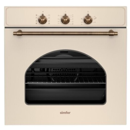 Электрический духовой шкаф Simfer B6EO18011 выполнен в ретро стиле и имеет независимый тип подключения. Отличительными особенностями данной модели являются бронзовая отделка фурнитуры и арочное остекление