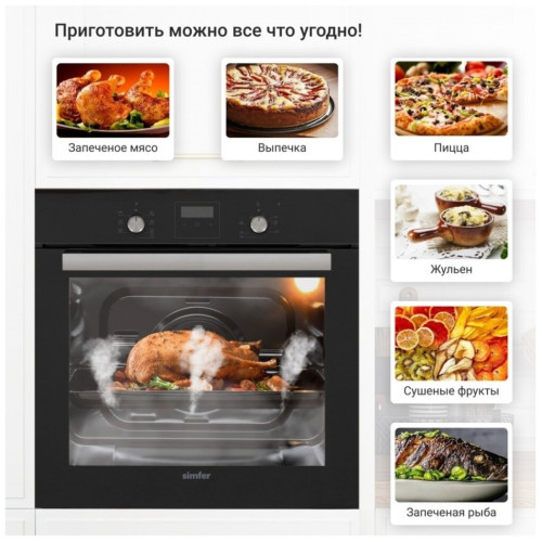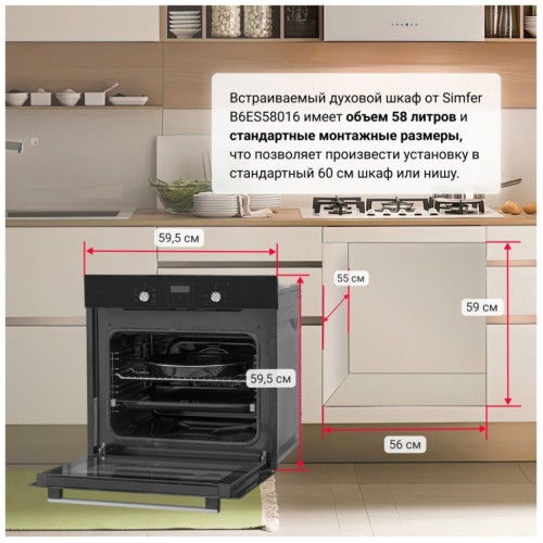 Встраиваемый электрический духовой шкаф Simfer B6ES58016 - описание: Электрический духовой шкаф Simfer B6ES58016 - современная техника для кухни, которая благодаря многообразию режимов, позволяет готовить не только повседневную пищу, но и изысканные блюда. Она снабжена функцией конвекции, которая равномерно распределяя теплый воздух, пропекает блюдо со всех сторон. А гриль запечет его до вкусной хрустящей корочки. С помощью удобных поворотных ручек легко выбрать необходимый режим приготовления для любого рецепта. Встроенная подсветка позволит наблюдать за процессом, не открывая при этом дверцу шкафа, а значит сохраняя тепло внутри.Таймер подскажет, когда блюдо будет готово, а двойное стекло защитит от ожога при случайном прикосновении к дверце шкафа. Эта простая в управлении, стильная и современная техника прекрасно впишется как в классический интерьер, так и в самый современный. Особенности: Специальный нагревательный элемент в духовке, создающий высокую температуру, позволяет добиться на продуктах румяной корочки. При этом приготовленная таким образом пища внутри остается нежной и сочной. Общие данные: Габариты: 59.5х59.5x61 см Габариты ниши для встраивания: 60x56x55 см Полезный объем: 58 л Конвекция: есть Гриль: естьм Количество режимов работы: 8 Очистка духовки: паровая Принадлежности: стандартный противень с антипригарным покрытием, глубокий противни с антипригарным покрытием, хромированная решётка Управление и функции: Управление механическое Переключатели: поворотные Утапливаемые ручки Таймер Системы безопасности: Автоматическое защитное отключение Дополнительная информация: Электрический термостат Подсветка камеры, вентилятор охлаждения, защитное отключение Дверца духовки: откидная Число стекол дверцы: два Класс энергопотребления: A Вес: 28 кг