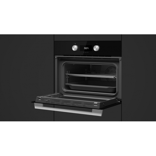 Teka HLC 8400 Night River Black Ключевые характеристики: * чёрное стекло/ нержавеющая сталь * 9 режимов приготовления + очистка Hydroclean * объём 44 л * фиксированные глянцевые регуляторы с металлическим ободком * стеклянная сенсорная панель управления + жидкокристаллический бело-красный дисплей * нержавеющая сталь с защитным покрытием от следов пальцев * стандартный доводчик двери * откидной макси-гриль c углом раскрыва 22,5° * протектор для защиты от ожога грилем * механический быстрый разогрев * разморозка * турборежим * PIZZA (нижний нагрев + турбо) * ECO режим * инновационное покрытие Slippery * динамическая система охлаждения (вентилятор с 1 скоростью) * рельефное дно камеры с углублением для воды для чистки Hydroclean * внутренняя поверхность дверцы из закалённого стекла * трёхслойная термоизолированная дверца * 2 съёмных внутренних стекла * блокировка для безопасности детей (таймер) * температурный диапазон 50-250 °С * телескопические направляющие на 1 уровне Особенности Коллекция Maestro Подойдет для тех, кто любит идти на шаг впереди. Для тех, кто не рассчитывает в своей жизни быть как все и хочет, чтобы каждый, кто окружает их, соответствовал их индивидуальности и интересам. Для тех, кто, помимо простоты использования и качества исполнения, ищет то, что поможет сделать пространство вокруг себя максимально индивидуальным и оставит свой след на повседневной жизни. Новая эмаль Slippery Очистка духовых шкафов стала еще более лёгкой, благодаря новой эмали Slippery, которая покрывает их внутреннюю поверхность. Эта эмаль последнего поколения дольше остается чистой, так как препятствует прилипанию частиц пищи и жира и имеет более гладкую и скользкую поверхность. Кроме того, эмаль Slippery более устойчива к воздействию кислот и других химических веществ, а также к ударам, которые иногда случаются в процессе готовки. Очистка паром Hydroclean ECO Ручной и очень экологичный способ. Налейте воды, установите режим нижнего нагрева на 90 градусов и 4 минуты, подождите 24 минуты, чтобы камера остыла, и всё! Совместная работа пара, который образуется внутри духового шкафа, и технологии Hydroсlean, обеспечивает удаление жира и загрязнений при помощи одного стакана воды и нескольких капель моющего средства. Программы приготовления * традиционный нагрев * гриль * максигриль * нижний нагрев * максигриль с вентилятором * турбо * пицца * программа ЭКО * разморозка * программа очистки Hydroclean * быстрый нагрев Реальная экономия Духовые шкафы потребляют на 20% меньше электроэнергии, чем модели прошлого поколения. Они могут сделать многое и при этом выбросы углерода сделают минимальными. Плавные телескопические направляющие Следите за процессом приготовления ваших блюд без риска опрокинуть противень, благодаря легкосъёмным телескопическим направляющим. Противни также оборудованы системой против опрокидывания. Блокировка от детей Блокировка безопасности предотвращает изменение параметров духового шкафа, особенно детьми. Если духовой шкаф выключен и режим безопасности детей включен, духовой шкаф не будет работать, даже при выбранной функции приготовления. Система охлаждения Система динамической вентиляции охлаждает горячий воздух до того, как он выходит наружу. Кроме того, обеспечивается дополнительная безопасность, так как минимизируется нагрев мебели. Аксессуары в комплекте: * 3-уровневые хромированные нап