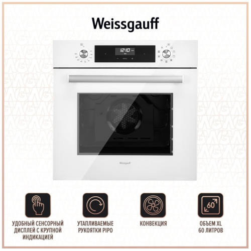 Электрический духовой шкаф EOV 291 от Weissgauff оснащён чувствительным сенсорным управлением, утапливаемыми рукоятками PIPO и 9 режимами, каждый из которых раскроет для вас новые возможности приготовления вкуснейших блюд! Удобный сенсорный дисплей с крупной индикацией - это настоящая гордость Weissgauff, ведь он не только является интуитивно понятным, но и великолепно реагирует на прикосновения с первого нажатия даже в том случае, если руки влажные или прохладные. Утапливаемые рукоятки PIPO - это эффективная защита элементов управления от случайных переключений и жировых испарений в процессе приготовления еды, а также дополнительное удобство при работе с духовым шкафом, дополняющее его технологическое совершенство. 9 функций духового шкафа, предлагающих самые необходимые и наиболее востребованные режимы. Книга рецептов, расположенная непосредственно на внутреннем стекле дверцы вашего духового шкафа, поможет быстро найти оптимальные настройки для приготовления любого, даже самого изысканного блюда. Богатая комплектация, включающая поддон для сбора жира, решетку и телескопические направляющие предоставит вам все необходимое для того, чтобы духовой шкаф радовал вас отличными и вкусными блюдами! Гидролизная очистка - особая технология, благодаря который вы раз и навсегда забудете те дни, когда духовой шкаф необходимо было с большим трудом вычищать, вкладывая в это непозволительно много времени и сил. Мы оснастили данную модель возможностью очистки паром: всего лишь добавьте небольшое количество воды, и духовой шкаф сам отпарит все загрязнения, используя