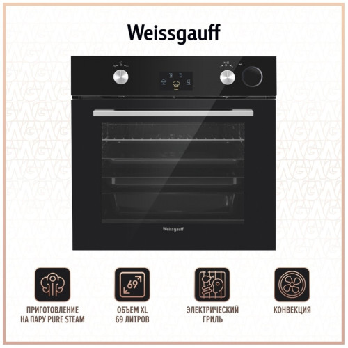 Weissaguff с гордостью представляет вам новую модель, которая является непревзойденным флагманом в линейке духовых шкафов 2022 года, на несколько порядков опережающим все аналоги, имеющиеся на рынке! Бесподобное сочетание премиальных функций не оставит равнодушным даже самого требовательного клиента! Режим приготовления с подачей пара, выдвижной резервуар для воды, расширенное многофункциональное меню с цветным информативным дисплеем, электронная книга рецептов автоматического меню - всё это и многое другое делает данную модель одним из наиболее передовых духовых шкафов, существующих на сегодняшний день! Серия PREMIUM создана Weissgauff, чтобы удовлетворить самые взыскательные запросы наших наиболее требовательных клиентов. Бесспорно высшее качество, расширенная функциональность и богатая комплектация, улучшенные показатели и доведенный до совершенства дизайн – все это вы найдете в моделях данной серии, воплощающих самые смелые мечты в реальность. Прикоснитесь к поистине легендарному уровню исполнения бытовой техники Weissgauff с моделями PREMIUM! Приготовление на пару Pure Steam это прекрасная возможность получить не только вкусную, но и полезную еду, всего лишь добавив воду в специальный резервуар и выставив соответствующую опцию на панели управления! Паровые котлеты из курицы и индейки, гарниры и овощи без использования масла, а также рыба и мясо на пару, исполненные на ресторанном уровне прямо у вас дома - теперь всё это становится реальностью с новым духовым шкафом от Weissgauff! Премиальный SMART-дисплей с цветным графическим отображением, представляет собой полноценную систему умного управления вашим духовым шкафом, включая в себя электронную книгу рецептов, настройки режима ручного приготовления, активацию системы очистки камеры, управление функцией подачи пара, детальную и чувствительную настройку температуры, контроль предварительного разогрева, библиотеку избранного и многое другое! Поворотные электронные рукоятки с функцией подтверждения нажатием - это инновация в технологии управления духовым шкафом, вручающая пользователю максимально удобный контроль всех опций при работе с многофункциональным меню! Объем XL 69 литров дает вам полную уверенность в том, что приобретая этот духовой шкаф, вы сможете разместить в нем сразу весь необходимый объем пищи, и даже профессионально работать на нескольких уровнях одновременно, порадовав себя и своих близких настоящим пиром, приготовленным в духовом шкафу Weissgauff на действительно ресторанном уровне. 9 функций духового шкафа, предлагающих самые необходимые и наиболее востребованные режимы: размораживание, турбоконвекция, верхний + нижний нагрев (традиционное приготовление), верхний + нижний нагрев с конвекцией, пицца, гриль, двойной гриль, двойной гриль с конвекцией, режим освещения. Электрический гриль, расположенный в камере духового шкафа, расширяет ваши возможности приготовления вкуснейших блюд, позволяя добиваться эффекта аппетитной золотистой корочки! Конвекция сделает распределение тепла в камере духового шкафа ещё более эффективным, обеспечивая интенсивное нагнетание и циркуляцию горячего воздуха! Комплектация, включающая в себя 2 противня различного размера и решетку для гриля, обеспечивает вас всем необходимым для приготовления по-настоящему вкусной еды без необход