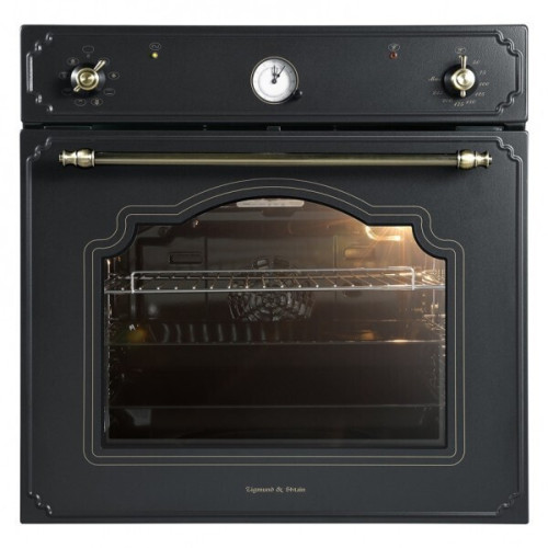 Духовой шкаф Zigmund & Shtain E 135 B, в черном цвете, органично впишется в Вашу кухню ретро-стиля. 7 режимов нагрева и освещение позволят Вам приготовить практически любое блюдо, аналоговой программатор поможет Вам установить время работы духовки с последующим отключением. Электрическая духовка Zigmund & Shtain E 135 B  имеет тангенциальное охлаждение и холодный фронт, что сделает пользование духовкой безопасным. Еще больше удобства за безопасным контролем готовки блюд дают телескопические направляющие, так как они позволяют противням выдвигаться равномерно, добавляя безопасность при проверке качества приготовления еды или ее извлечении. С телескопическими направляющими не нужно удерживать противни на весу. Металлическая ручка дверцы и ручки управления. Функции духового шкафа: освещение, разморозка, верхний и нижний нагреватель, гриль и вентилятор, гриль, турбо-гриль, турбо-гриль и вентилятор, нижний нагреватель и вентилятор.