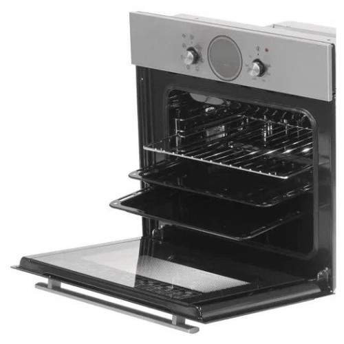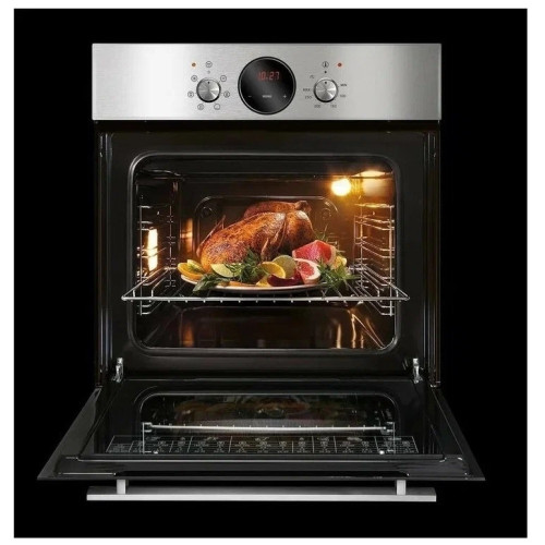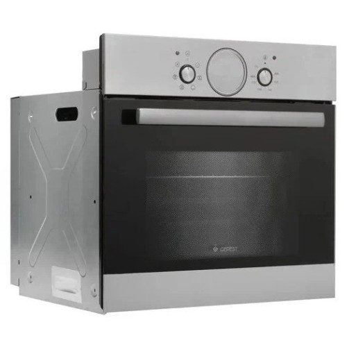 Электрический духовой шкаф. Классический дизайн современного образца, управление осуществляется двумя поворотными ручками: выбор режима работы и температуры нагрева. В середине панели управления установлен сенсорный таймер, есть часы и звуковой сигнал окончания работы программы. Помимо классического нагрева с автоматическим поддержанием заданной температуры, в комплектации присутствует электрогриль и вертел. Есть конвекция, равномерно распределяющая жар внутри шкафа. Запросто приготовить курицу-гриль, подрумянить выпечку, целиком запечь кусок мяса - духовой шкаф позволяет создавать кулинарные шедевры легко и просто. Продуман и контроль за готовностью блюда, внутреннее освещение - двухточечное, через двойное стекло прекрасно все видно и без открытия дверцы. Уход за прибором не доставляет проблем, для удобного доступа направляющие для противней и дверца - выполнены съемными. Размеры монтажного проема - 56x55x58 см (ШхГхВ), сетевой шнур и вилка в наличии. Ключевые преимущества: - Таймер сенсорный; - Усиленный гриль с конвекцией; - Вертел с электроприводом; - Подсветка духовки двойная; - Съемные проволочные направляющие духовки.