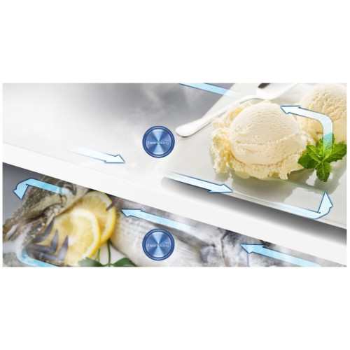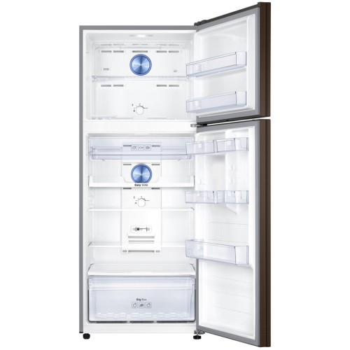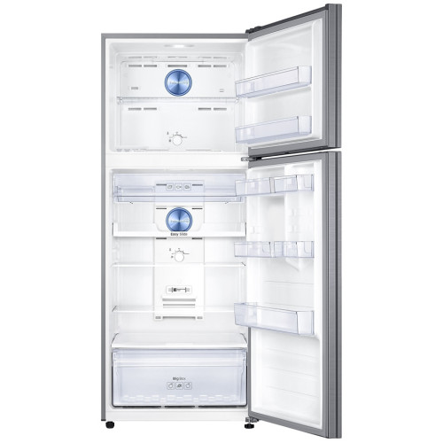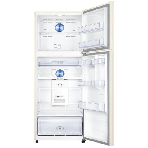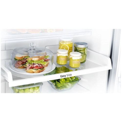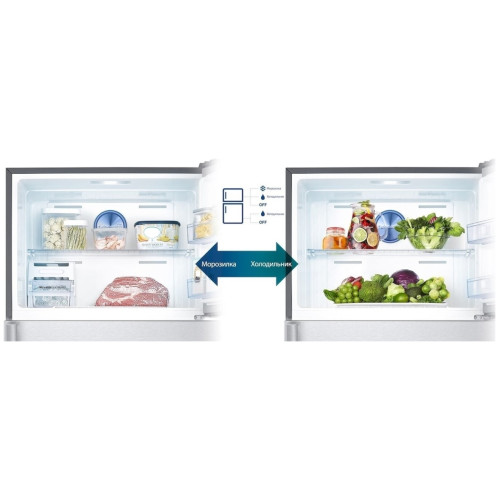 Холодильник Samsung RT6000K предполагает верхнее расположение морозильной камеры, что в связи с небольшой высотой прибора является удобным. Размеры холодильника составляют 70x182.5x72.6 см, при этом он является очень вместительным: его полезный объем равен 440 л. Из этого объема 329 л занимает холодильное отделение, а 111 л отводится морозильное камере. Наличие нулевой зоны в пространстве холодильного отделения позволяет продуктам сохранять свежесть намного дольше. Прибор обладает небольшой мощностью замораживания 6 кг/сутки. Его особенность в полностью автоматизированном размораживании благодаря поддержке системы No Frost. Это избавляет пользователей Samsung RT6000K от ручного размораживания. Морозильная камера разделена на две зоны стеклянной полочкой, а внутри холодильного отделения предусмотрены четыре полочки, небольшой контейнер для колбас и сыров и ящик для фруктов и овощей.