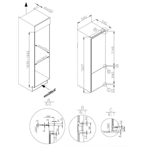 Система разморозки Total NoFrost Тип компрессора Стандартный Общий объём, л 275 Полезный объём, л 273 Высота, мм 1937 Глубина, мм 550 Ширина, мм 540 Уровень шума, дБ 41 Тип управления Сенсорное Тип установки/монтажа Встраиваемый Тип освещения LED Энергопотребление, кВтч/год 312 Класс энергетической эффективности A+ Количество ящиков холодильного отделения 1 Количество полок холодильной камеры 6 Количество боковых полок 4 Материал фасада Металл Материал корпуса Металл Расположение морозильной камеры Снизу Перенавешиваемые двери да Звуковая индикация при открытых дверях да Мощность замораживания кг/в сутки 3 Хладагент R 600a Климатический класс ST Вес товара без упаковки (нетто), кг 64 Вес товара (брутто), кг 69 Код товара КА-00017290 Страна Китай