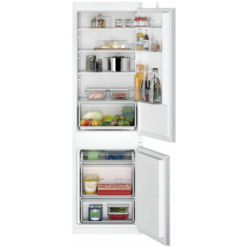 Встраиваемый двухкамерный холодильник Siemens KI86VNSF0, произведенный в Германии, сочетает в себе современные технологии и функциональный дизайн. Это устройство обладает общим полезным объемом 255 литров, что позволяет хранить большое количество продуктов. Благодаря системе заморозки LowFrost, равномерное охлаждение всего объема морозилки происходит постепенно, минимизируя образование наледи. Это делает устройство удобным в использовании и экономичным, так как требуется размораживать его всего лишь раз в год. Модель оснащена электронным управлением и LCD дисплеем, что обеспечивает удобство и простоту использования. Светодиодное освещение обеспечивает яркое и равномерное освещение, благодаря чему вы всегда будете видеть содержимое. Режим суперохлаждения позволяет быстро охладить большое количество продуктов, что особенно актуально при покупке продуктов на неделю вперед. В холодильной камере предусмотрено 4 ударопрочных стеклянных полки, три из которых регулируемые по высоте. Это позволяет оптимально использовать пространство внутри, адаптируя его под свои потребности. Дополнительный выдвижной ящик для фруктов и овощей обеспечивает их свежесть и сохранность. Морозильная камера имеет объем 84 литра и оснащена тремя ящиками, включая ящик для хранения крупногабаритных продуктов bigBox. Режим суперзамораживания позволяет быстро заморозить продукты, сохраняя их витамины и полезные свойства. Календарь хранения продуктов поможет вам контролировать сроки хранения различных продуктов. Устройство оснащено технологией iSensoric, которая обеспечивает оптимальные условия хранения продуктов. Индикация температуры позволяет контролировать температурный режим, не открывая дверцы. Звуковая сигнализация при открытой двери и звуковой сигнал об ошибке помогут избежать нежелательного повышения температуры. Холодильник отличается энергоэффективностью класса A++, что обеспечивает экономное потребление электроэнергии. Кроме того, устройство имеет стильный белый цвет и вписывается в любой интерьер. Скользящее крепление дверцы позволяет легко интегрировать холодильник в кухонный гарнитур. Ключевые преимущества: Система заморозки LowFrost обеспечивает равномерное охлаждение и минимизирует образование наледи. Режимы суперохлаждения и суперзамораживания позволяют быстро охладить и заморозить большое количество продуктов. Технология iSensoric и индикация температуры обеспечивают оптимальные условия хранения продуктов.