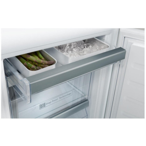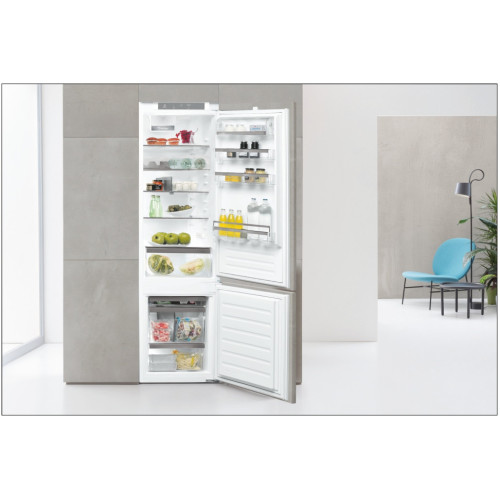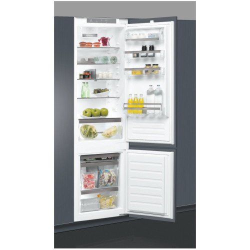 Преимущества встраиваемого комбинированного холодильника Whirlpool: Белый цвет. Высокий прибор, отвечающий потребностям вашей семьи. Стеклянные полки с обработкой кромок, обеспечивающие прочность, элегантность и исключительную безопасность. Вентилятор, который обеспечивает плавный и равномерный поток воздуха в пространстве прибора для идеальной циркуляции воздуха. Уникальная технология 6. ZMYSEL Fresh Control, которая автоматически регулирует уровень температуры и влажности внутри прибора для обеспечения длительного сохранения свежести Папка для бутылок Безопасное хранение. Этот холодильник Whirlpool обеспечивает идеальное место для хранения бутылок благодаря специальному отделению для бутылок в дверце холодильника. Стоп Мороз Разморозка за одну минуту. Забудьте об образовании инея в вашей морозильной камере с системой Stop Frost. Для разморозки просто снимите коллектор и промойте его под холодной водой всего за 1 минуту. Обратная дверь Двусторонние дверные петли для большей универсальности в соответствии с планировкой вашей кухни — открываются влево или вправо. Свежая коробка Создает идеальные условия для хранения фруктов и овощей. Ящик для хранения фруктов и овощей. Быстрое охлаждение Быстрое охлаждение. Температура внутри холодильника понизится сразу после хранения новых продуктов. Встроенные датчики автоматически регулируют температуру охлаждения, обеспечивая тем самым низкое энергопотребление и более длительную свежесть. Меньше Мороза Забудьте об глазури. Инновационная технология Less Frost имеет уникальный испаритель, расположенный вокруг внутренних боковых стенок морозильной камеры, а не между ящиками, благодаря чему обеспечивается радикальное снижение образования инея. Технология ZenInverter Наслаждайтесь тишиной на кухне с оптимальной производительностью и низким уровнем шума благодаря инверторному компрессору нашей линейки комбинированных холодильников с морозильной камерой. Размеры Высота (см) : 193,5 Ширина (см) : 54,0 Глубина (см) : 54,5 Общий объем морозильной камеры (л) : 79 Общий объем холодильника (л) : 228 Глубина установки : 56,0 Минимальная высота для установки : 194,0. Минимальная ширина для установки : 56,0 Функции Система установки дверцы крышки : Раздвижная Тип установки : Встроенный Тип : Комбинированный холодильник и морозильник. Полка для бутылок Общий объем морозильных камер (ЕС 2017/1369) : 79 Производительность замораживания (кг/24 ч) (отсек 4 звезды) (EU2017/1369) : 4 Общий объем продукции (ЕС 2017/1369) : 306 Сумма объемов охлаждающих помещений и незамерзающих частей (ЕС 2017/1369) : 227 Управление : Электронное Размораживание холодильника : Автоматическое. Размораживание морозильной камеры : Ручное. Количество корзин в морозильной камере : 3. Количество температурных зон : 2 Количество регулируемых полок в холодильнике : 4. Количество полок в холодильнике : 5. Предупреждающий сигнал/неисправность : Визуальный Цвет : Белый EAN-код : 8003437045950 Длина электрического кабеля (см) : 245 Монтаж декоративной двери : Невозможно Технические данные Класс энергоэффективности (регламент (ЕС) 2017/1369) : А+ Годовое потребление энергии в киловатт-часах в год (кВтч/год) (ЕС) 2017/1369 : 225 Класс заморозки : 4 Устойчивость к сбою питания (ч) : 19 Электрическое подключение (Вт) : 140 Токовый предохранитель (А) : 16 Быстрое охлаждение : Да Функция быстрого замораживания (ЕС 2017/1369) : Нет Эмиссия воз