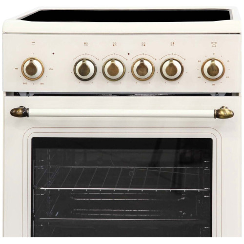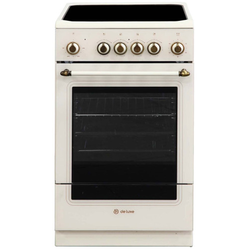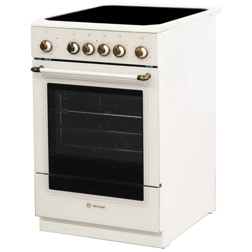 DE-LUXE 506004.13эс-023 — электрическая плита с четырьмя рапидными конфорками и стеклокерамическим покрытием, которое хорошо проводит тепло в вертикальном направлении. Конфорки делятся на два типа: одна пара имеет диаметр 18 см и мощность 1,7 кВт, другая — 14 см и 1,2 кВт соответственно. Особенность рапидных конфорок заключается в том, что они быстро нагреваются. Это позволяет приступить к процессу готовки как можно быстрее. При этом на них можно готовить как в небольших емкостях, так и в достаточно крупных сковородах и кастрюлях. Поверхность из стеклокерамики быстро нагревается и так же быстро остывает. Кроме того она отличается хорошей прочностью. Мыть покрытие из такого материала рекомендуется специальными средствами, в которых нет абразивных частиц, без использования металлических щеток. Духовка DE-LUXE 506004.13эс-023 работает от электричества. Ее объем равен 54 л, максимальная температура нагрева достигает 270 градусов. Внутренняя поверхность покрыта эмалью. Для удобства приготовления различных блюд духовка оснащена тремя режимами работы. Кроме этого в ней предусмотрен вертел и гриль. За освещение отвечают галогенные лампочки, которые дают достаточно света. Дверца с двойным стеклом открывается по направлению вниз. По энергоэффективности электрическая плита этой модели относится к классу А. В комплекте есть плоский и глубокий противни, а также решетка для духовки.