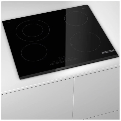 Электрическая варочная панель Bosch PKF631FP3E шириной 60 сантиметров со скошенным краем. Четыре конфорки расположены под стеклокерамикой. Круглая зона расширения 12 и 21 сантиметр позволяет использовать посуду большого диаметра. Режим PowerBoost экономит время при разогревании больших объемов жидкости. Блокировка от детей предотвращает непреднамеренное включения варочной панели. Cенсорное управление DirectSelect Интуитивная панель позволяет выбрать конфорки и задать нужный вам уровень мощности & быстро и просто. Для установки таймера или выбора необходимого уровня мощности, надо просто нажать на кнопки с соответствующими цифрами. 17-ступеней мощности Полностью электронное управление с 17-ступенчатой регулировкой мощности. Таймер Может быть установлен до 99 минут. Можно использовать как: Таймер с функцией отключения для каждой конфорки; Сигнальный таймер (без отключения конфорок). Cleaning-пауза Временная блокировка панели управления. Если вы протираете панель управления в то время, когда варочная поверхность включена, то нет риска случайного изменения установок. Для предотвращения этого используйте Cleaning-паузу, после активации которой панель управления блокируется на 20 секунд. Главный выключатель Позволяет выключить ВСЕ конфорки одновременно одним нажатием. Индикация остаточного тепла Для каждой конфорки осуществляется двухпозиционная индикация остаточного тепла, которая предупредит, что поверхность еще горячая. Можно использовать остаточное тепло для подогрева. Дисплей индикации энергопотребления Количество использованной за последнюю готовку энергии демонстрируется в течение 10 секунд на дисплее после выключения панели. Энергопотребление меряется за время от включения до выключения панели. Цифровая индикация ступени нагрева Для каждой конфорки на варочной панели предусмотрена индикация утановленной ступени нагрева.