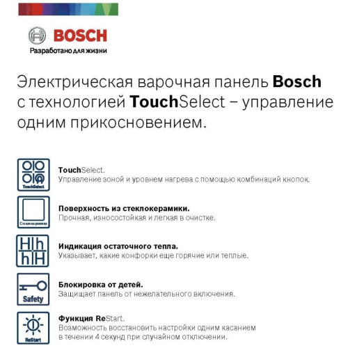 Общие данные: Габариты: 4.8x58.3x51.3 см Габариты ниши для встраивания: 4.8x56x49-50 см Тип конфорок: 4 быстрого нагрева Зоны расширения: 1 радиальная Мощность конфорок: Передняя левая: 145 мм, 1.2 кВт Левая задняя: 180 мм, 2 кВт Задняя правая: 145 мм , 1.2 кВт Передняя правая: 120 мм, 210 мм, 0.75 кВт Индикаторы остаточного тепла для каждой конфорки Управление и функции: Управление TouchSelect: Управляйте мощностью с помощью сенсорных кнопок /-. 17 ступеней мощности: точная регулировка уровней мощности с помощью 17 уровней (9 основных уровней и 8 промежуточных уровней). Таймер приготовления (с отключением) для каждой конфорки: выключает конфорку по истечении установленного времени (например, для вареных яиц). Бытовой таймер: в конце установленного времени звучит сигнал (например, для макаронных изделий). С помощью функции reStart варочная поверхность сохраняет все настройки, и их можно восстановить после автоотключения : в случае непреднамеренного выключения восстановите все предыдущие настройки, снова включив варочную панель в течение 4 секунд. Функции безопасности: Индикация остаточного тепла: указывает, какие конфорки еще горячие или теплые. Функция Детская безопасность с возможностью настройки автовключения: предотвратить непреднамеренное включение варочной панели. Главный выключатель позволяет одним нажатием отключить все конфорки и восстановить настройки при случайном отключении: выключите все конфорки одним нажатием кнопки. При отсутствии изменения настроек варочная поверхность отключится автоматически, время отключения зависит от выбранной мощности : по соображениям безопасности нагрев прекращается по истечении заданного времени без вмешательства пользователя (настраивается). Дополнительная информация: Рамка из стали по периметру Минимальная толщина столешницы: 16 мм Подключение: 6600 Вт