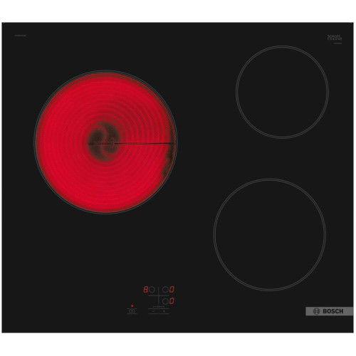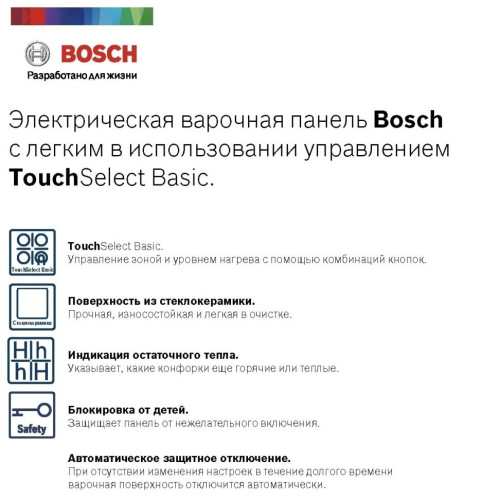 Варочная панель BOSCH PKM61RAA8E оснащена 3 конфорками разного диаметра и мощности, настройка интенсивности приготовления по 9 ступеням производится при помощи сенсорной панели TouchSelect. Для безопасной эксплуатации предусмотрена блокировки от детей.