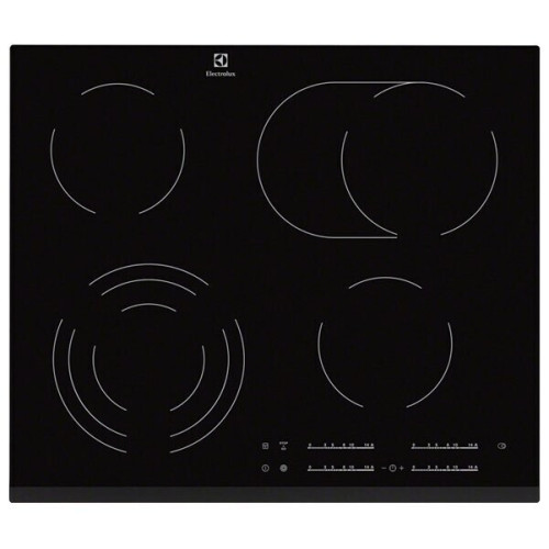 * электрическая варочная панель * стеклокерамическая поверхность * керамические конфорки * трехконтурная конфорка * конфорка с овальной зоной нагрева * переключатели сенсорные * защита от детей * индикатор остаточного тепла * независимая установка * габариты (ШхГ) 59x52 см