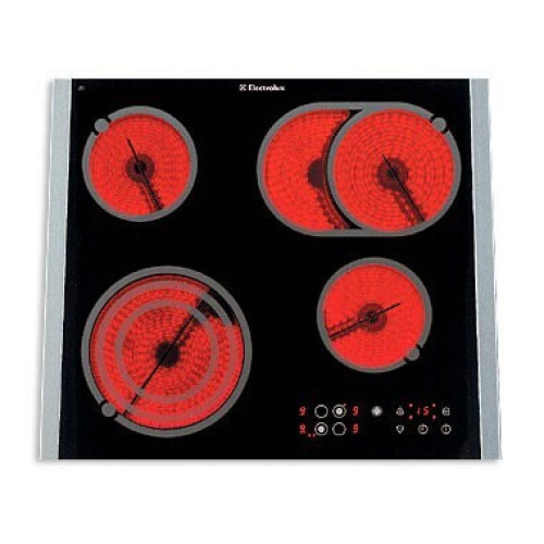 Дизайн рамки - трапеция. Будильник. Цифровые индикаторы остаточного тепла для каждой конфорки, кнопка блокировки панели. Отключение при неактивации в течение 10 минут. В комплекте скребок для чистки стеклокерамической поверхности.