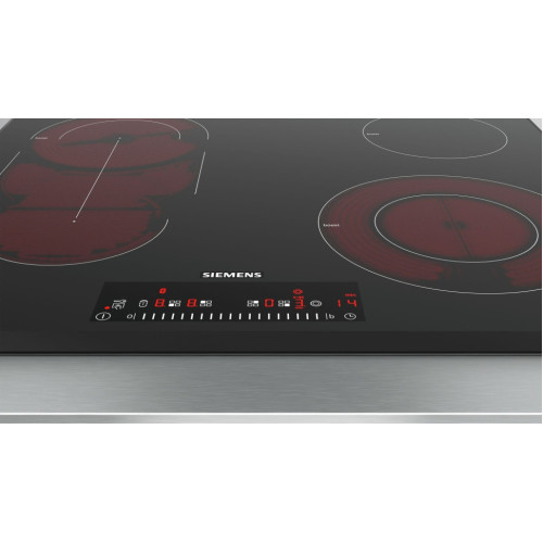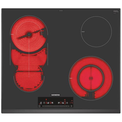 Общие данные: Габариты: 4,5х59,2х52,2 см Габариты ниши для встраивания: -х56х49-50 см Рабочий стол: стеклокерамика Количество конфорок: 4 быстрого нагрева Зоны расширения: радиальная и сombiZone Мощность конфорок: Задняя левая: 1/2/3,4/4,6 кВт 120/180/270/370 мм Задняя правая: 1,2 кВт 145 мм Передняя левая: 1,2 кВт 145 мм Передняя правая: 0,8/2,1 кВт 120/210 мм Индикаторы остаточного тепла для каждой конфорки Управление и функции: Сенсорное управление DirectSelect 17 ступеней мощности Дисплей индикации уровня мощности для каждой конфорки Таймер с отключением Таймер без отключения (со звуковым сигналом) Cleaning-пауза: кратковременная блокировка панели до 30 секунд Функция reStart Функция PowerBoost Безопасность: Главный выключатель Двухпозицонные индикаторы остаточного тепла Блокировка от детей Защитное отключение Дополнительная информация: Варочная панель со скошенным краем Стеклокерамика с защитным покрытием Минимальная толщина столешницы 20 мм