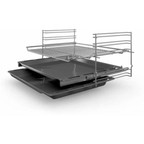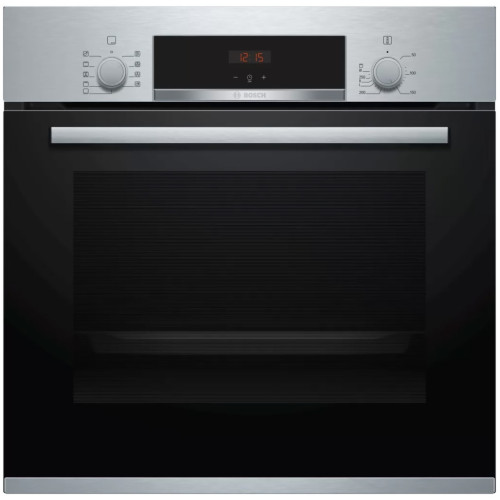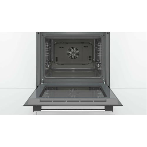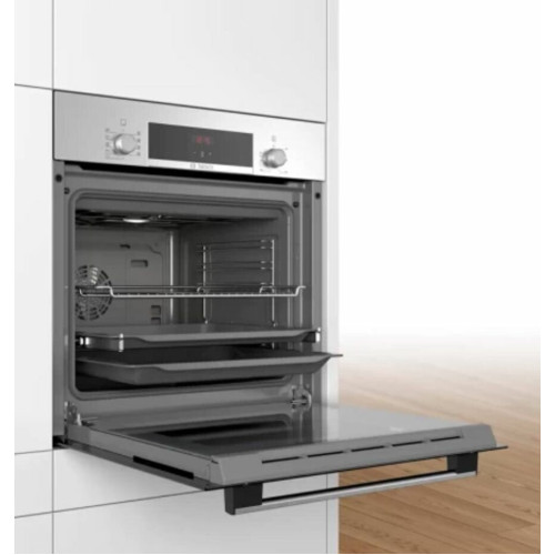 Электрический духовой шкаф Bosch Serie 4 HBF534ES0Q оборудован сенсорной панелью управления и утапливаемыми переключателями, с помощью которых осуществляется настройка режима, температуры нагрева и активация дополнительных функций. Духовой шкаф работает в диапазоне температур от 50°С до 275°C. Широкий выбор режимов позволяет установить оптимальные параметры в зависимости от рецептуры блюда. Функция размораживания предназначена для бережного и равномерного оттаивания полуфабрикатов. Режим конвекции обеспечивает принудительную циркуляцию горячего воздуха внутри камеры, что способствует качественному пропеканию ингредиентов со всех сторон. Чтобы добиться хрустящей корочки на птице или подрумянить тосты для завтрака, необходимо использовать гриль. Электрический духовой шкаф Bosch Serie 4 HBF534ES0Q оснащен телескопическими направляющими, что помогает плавно выдвигать противень. Встроенная лампа освещает пространство, поэтому для наблюдения за кулинарным процессом не нужно открывать дверь. Информация о ходе программы и времени приготовления пищи отображается на дисплее.