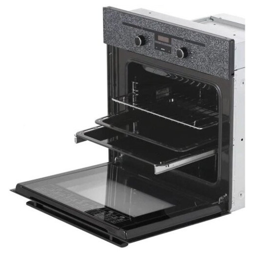 Электрический духовой шкаф, фасад декорирован стеклянной поверхностью. Поворотные ручки управления дополнены сенсорным таймером со звуковым сигналом, духовка работает в нескольких режимах. Классический нагрев с автоматическим поддержанием заданной температуры дополнен конвектором. Конвекция ускоряет нагрев, равномерно распределяет жар по всему полезному объему жарочного шкафа. В комплектации также усиленный гриль. Многофункциональность духового шкафа открывает практические неограниченные возможности в готовке. Дверца с двойным стеклом не раскаляется от нагрева и при уборке легко снимается, открывая доступ к внутренним поверхностям. Для этой цели и направляющие для противней выполнены съемными. Установлены телескопические направляющие для удобного полного выдвижения противня, а сама духовка с двухточечной подсветкой. Размеры монтажного проема - 56x55x58 см (ШхГхВ), сетевой шнур и вилка в наличии. Ключевые преимущества: - Таймер сенсорный; - Усиленный гриль с конвекцией; - Подсветка духовки двойная; - Телескопические направляющие; - Съемные проволочные направляющие духовки.