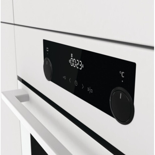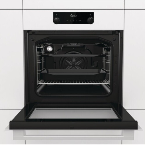 Независимая духовка Gorenje BO735E20W белого цвета с утапливаевыми переключателями и электронным дисплеем. Прибор имеет специальную программу очистки AquaClean, при помощи пара загрязнения на стенках рабочей камеры размягчаются, и их легко убрать с плотной эмали.