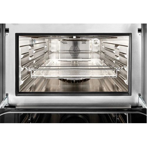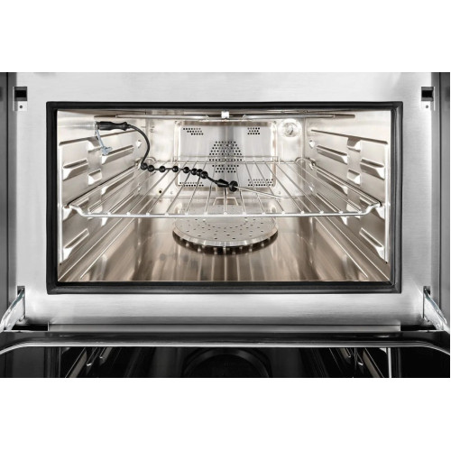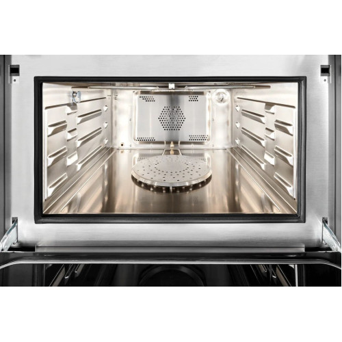 Описание Общие характеристики Класс энергоэффективности: A+ Температура приготовления: 30-250 °C Электронный программатор с сенсорным TFT-дисплеем Электронный контроль температуры Температурный зонд Галогенная подсветка рабочей камеры Холодный фронт дверцы с трехслойным остеклением (EN60335-2-6-11.101) Высококачественная термоизоляция Тангенциальный вентилятор охлаждения с двумя режимами работы Защита от детей Функции подробнее о режимах работы Приготовление с конвекцией Приготовление пищи на гриле с закрытой дверцей Приготовление на гриле с конвекцией Приготовление в микроволновой печи Пропаривание Комбинированное приготовление на пару/горячем воздухе Комбинированное приготовление на пару/СВЧ Комбинированное приготовление горячим воздухом/СВЧ Комбинированное приготовление на гриле/микроволнах Цикл очистки паром Характеристики рабочей камеры • Рабочая камера из нержавеющей стали AISI 304 • Размеры: 41,5×21×41 см • Объем: 36 л • Термостат с электронным датчиком температуры Технические характеристики • Макс. мощность 3,4 кВт • Электрогриль 1900 Вт • Кольцевой нагревательный элемент 1600 Вт • Парогенератор 1200 Вт • СВЧ-генератор 1600 Вт