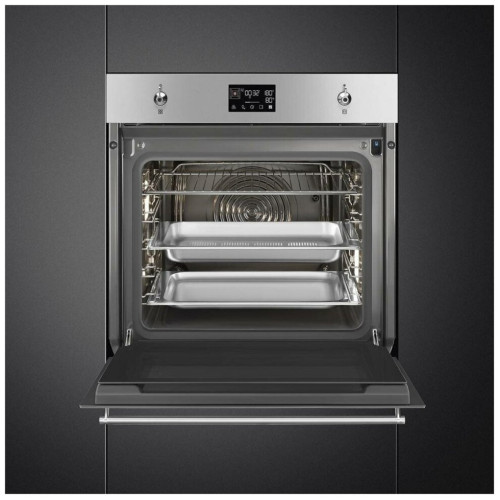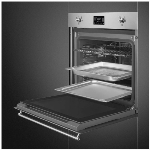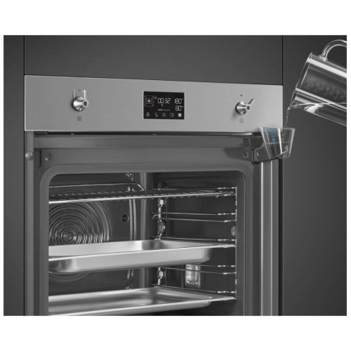 Общие характеристики - Тип: электрический - Тип подключения: независимая - Очистка: гидролизная - Материал камеры: эмаль Ever Clean - Материал фронтальной панели: нержавеющая сталь - Объем духовки: 67 л - Объем резервуара для воды: 0.8 л - Цвет: серебристый - Цвет фурнитуры: серебристый Управление - Тип управления: электромеханическое - Переключатели: поворотные, сенсорные - Расположение переключателя: на поверхности духового шкафа - Тип дисплея: LCD - Таймер: таймер включения/выключения, таймер с акустическим сигналом - Звуковой таймер: да Индикация - Индикация режима работы: да - Индикация окончания приготовления: да - Индикация выбранной мощности: да - Индикатор текущей температуры: да Режимы работы - Количество режимов работы: 16 - Режимы работы: статический нагрев, конвекция, термоконвекция, турбо, Eco, гриль большой, нижний нагрев, пицца, пар, пар + конвекция, пар + термоконвекция, Sous-vide, размораживание, поднятие теста, барбекю, аэрогриль - Приготовление на пару: да - Программа размораживания: по времени - Термощуп: да - Режим поддержания температуры: да - Количество уровней приготовления: 5 - Максимальная температура духового шкафа: 250 °С Безопасность - Тангенциальное охлаждение: да - Блокировка панели управления: да - Блокировка от детей: да - Автоматическое отключение при открытой дверце: да Мощность и энергопотребление - Класс энергопотребления: A++ - Потребляемая мощность: 3000 Вт - Мощность гриля: 1750 Вт Дополнительная информация - Дополнительные возможности духового шкафа: быстрый разогрев, вентилятор охлаждения, пар+конвекция, программа очистки от накипи - Особенности конструкции духового шкафа: съемная дверца, съемное внутреннее стекло, температурный зонд (термощуп), петли Soft close - Дверца духовки: откидная - Количество стекол дверцы: 3 - Режим шаббат: да - Часы: электронные - Тип освещения: галогенная лампа - Количество ламп освещения: 2 - Мощность одной лампы: 40 Вт - Количество уровней направляющих: 5 - Полозья для противней: металлические - Защитное покрытие от отпечатков пальцев: да - Дополнительная информация: функция Eco Light, режим Showroom Комплектация - Комплект поставки: решётка с ограничителем, решётка для противня, противень глубокий эмалированный 50 мм, противень стальной 20 мм, противень глубокий из перфорированной стали 40 мм, комплект для залива воды - Термозонд: да - Сетевой кабель: 1.15 м - Инструкция: да Размеры и вес - Высота: 59.2 см - Ширина: 59.7 см - Глубина: 54.8 см - Высота вст.