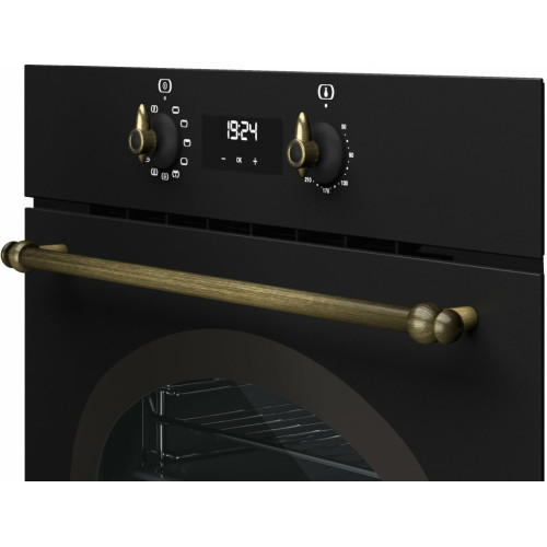 Описание модели Teka HRB 6400 ATB BRASS: Духовой шкаф Teka HRB 6400 ATB BRASS из коллекции WISH COUNTRY выполнен в цвете «антрацитовая эмаль», а фурнитура сделана под состаренную бронзу. Управление осуществляется при помощи сенсорного программатора с дисплеем и поворотных переключателей. В модели предусмотрены 9 режимов нагрева, а также очистка HydroClean PRO. Двухслойная термоизолированная дверца с 1 съёмное внутренним стеклом, а также вентилятор охлаждения защищают фронтальную поверхность от перегрева. Ключевые преимущества: Механический быстрый разогрев Неоткидной макси-гриль Рельефное дно камеры с углублением для воды общие характеристики Тип духовки независимая Способ подключения электрический Ширина (см) 59.5 Высота (см) 59.5 Глубина (см) 55.9 Габариты, см (ВхШхГ) 59.5х59.5х55.9 Размеры ниши для встраивания, см (ВхШхГ) 59х56-56.8х58 Объем (л) 70 Вид духовки полноразмерная дизайн Коллекция Country Цвет антрацит Фурнитура состаренная бронза Материал панели управления эмаль функции, технологии Тип гриля электрический Быстрый разогрев Да Функция ECO Да управление Программатор электронный Переключатели сенсорные поворотные Дисплей цифровой Таймер Да режимы нагрева Количество режимов нагрева 9 Верхний / нижний нагрев Да Макси-гриль Да Гриль Да Макси-гриль с конвекцией (вентилятор) Да Нижний нагрев Да Турбо Да дополнительные режимы Функция разморозки Да Режим для пиццы Да очистка Очистка HydroClean PRO Внутреннее покрытие духовки инновационное Slippery комфорт Дверца духовки откидная Доводчик двери Да Освещение лампа накаливания Количество ламп 1 Тип направляющих хромированные Телескопические направляющие на 1-м уровне Кол-во уровней приготовления 5 Температурный диапазон, °С 50-250 Съемное стекло дверцы Да