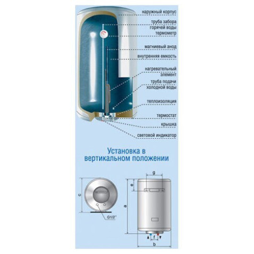 Тип водонагревателя накопительный Способ нагрева электрический Номинальная мощность 1.5 кВт Нагревательный элемент трубчатый Способ подачи воды напорный Объем бака 50 л Подводка нижняя Способ крепления настенный Внутреннее покрытие бака стеклокерамика Установка вертикальная Макс. Температура нагрева воды 75 °С Предохранительный клапан да Обратный клапан нет Защита от перегрева нет Сухой ТЭН нет Магниевый анод да Мин. Давление воды 0.50 атм Макс. Давление воды 8 атм Ускоренный нагрев нет Ограничение температуры нагрева да Режим предотвращения замерзания нет Термометр да Кран нет Душевая насадка нет Индикация включения да Индикация нагрева нет Дисплей нет Самодиагностика нет Пульт нет Напряжение сети 220 В Ширина 43 см Глубина 43 см Высота 55,6 см Цвет белый Вес 20 кг