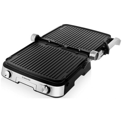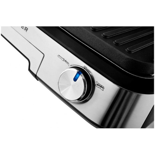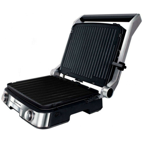 Особенности и функции: * Двухсторонние съёмные моющиеся пластины с антипригарным покрытием * 2 поверхности: рифлёная – для стейков, и плоская – для блинчиков и овощей * Размер пластин 31*26,4 см * Подстройка расстояния между пластинами по высоте продукта * Нагревательные элементы в верхней и нижней части гриля * Корпус из высокопрочного пластика, декорированный нержавеющей сталью * Механический регулятор температуры * Открытие крышки на 105-180°