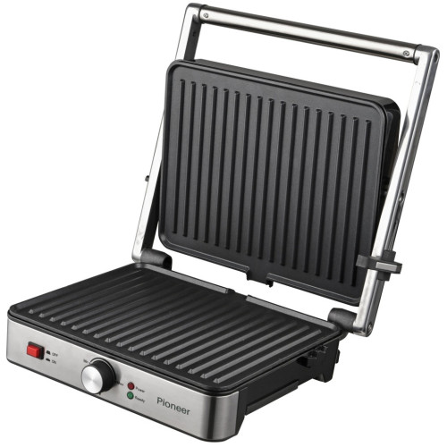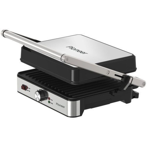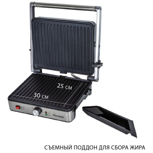 Современный электрический гриль Pioneer GR1002E с антипригарным покрытием - идеальное решение для приготовления мясных, рыбных или овощных блюд, блинчиков, яичниц, панини или гренок в домашних условиях. ключевые характеристики мощность: 2000 Вт регулировка уровня температуры нагрева Равномерный нагрев варианты использования: закрытое/ открытое на 105° / открытое на 180° области применения приготовление мясных блюд приготовление рыбных блюд приготовление овощных блюд поджарка яичницы выпечка блинчиков приготовление панини или гренок приготовление горячих бутербродов, сэндвичей или бургеров конструктивные достоинства стильный дизайн Комбинированный корпус: металл/пластик Антипригарное покрытие Съемный поддон для сбора жира Размер панелей: 30 x 25 cm особенности И преимущества Надежное механическое управление Световая индикация работы и нагрева оснащение Лоток для сбора жира Пластиковая лопатка для бережной чистки рабочей поверхности описание: Стейки, колбаски и рыба часто пригорают на гриле? Вкусная аппетитная корочка остается на пластинах? Пригоревший гриль сложно отмыть?Не отчаивайтесь! Ваша проблема уже решена! Воспользуйтесь электрическим грилем Pioneer с системой антипригарного покрытия 5G.За экологичность, надежность, выдающиеся антипригарные свойства и инертность к пищевым продуктам здесь отвечает ни 2, ни 3, а целых 5 слоев. Перечислим их от верхнего до нижнего. 1. Сверхгладкое нанопокрытие с полным отсутствием пор обеспечивает: Антибактериальный эффект. При отсутствии пор частичкам пищи негде собираться, а значит нет базы и питательной среды для развития бактерий Антипригарный эффект. Сниженный до минимально возможного коэффициент трения исключает налипание и пригорание продуктов 2. Сверхпрочная основа всего покрытия с использованием алмазной крошки создает: Устойчивость к повреждениям. Использование самого прочного материала в мире - алмазной крошки - делает все покрытие надежным, долговечным и устойчивым к повреждениям, существенно продлевая ресурс гриля 3. Антибактериальный слой с применением наночастиц серебра гарантирует: Выраженный антибактериальный эффект, основанный на обеззараживающих свойствах серебра 4. Теплопроводный слой из сплавов алюминия создает: Ускоренный нагрев и правильное распределение тепла для быстрой и равномерной прожарки 5. Слой с шероховатой структурой содержит: Эффект усиленного сцепления антипригарного покрытия с основой нагревательной поверхности за счет шероховатой структуры с увеличенной площадью. Покрытие с такой основной не “слезает” с поверхности и служит долго.