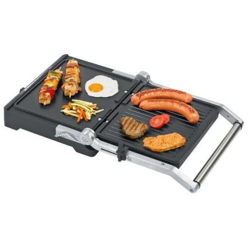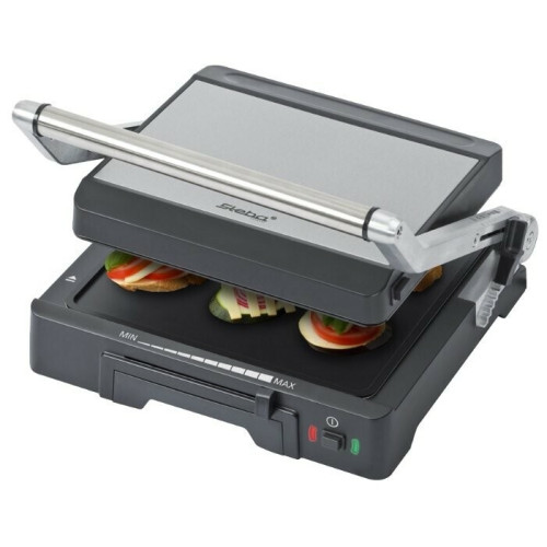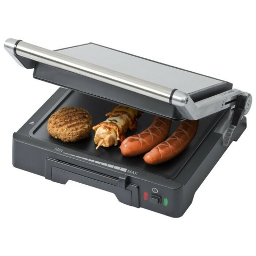 Удобным грилем Steba FG 70 можно пользоваться не только дома, но и на даче. Обширная площадь рабочей поверхности позволяет приготавливать блюда на этом устройстве двумя способами. Вы быстро пожарите мясо, закрыв крышку устройства, благодаря двустороннему нагреву. Либо можно приготовить в два раза больше продуктов за счет встроенных в верхнюю часть корпуса шарниров, позволяющих откинуть крышку устройства на 180 градусов и использовать ее как плиту для жарки. Нагревающиеся пластины гриля оснащены антипригарным покрытием, за счет которого готовящиеся на Steba FG 70 продукты не прилипают к поверхности и покрываются хрустящей ароматной корочкой. На этой модель доступно приготовление стейков любой степени прожарки благодаря регулируемому термостату. Весь стекающий с мяса жир и сок скапливается в специальном отсеке, который после остывания прибора можно легко извлечь и помыть в теплой мыльной воде.